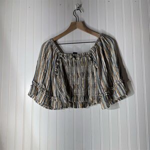 Angie Boho Peasant Blouse L Striped Off Shoulder Smocked Ruffle Sleeve Festival