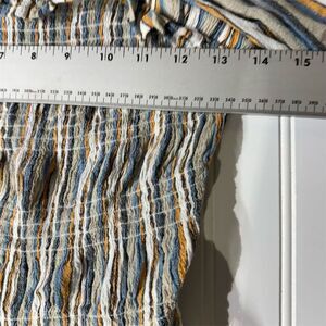Get into effortless boho vibes with this Angie peasant blouse, size large. Made in India from 100% rayon, this soft and breathable top features a multicolor vertical stripe pattern in earthy tones of mustard, denim blue, white, and tan. The smocked bodice and wide neckline allow for versatile wear — style it on or off the shoulder. Feminine ruffle trim details add extra charm at the sleeves and hem.