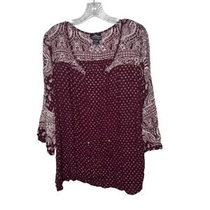 Elevate your boho style with this Angie burgundy peasant blouse in size Large. Featuring a mixed paisley and polka dot print, tassel tie neckline, and 3/4 flowy sleeves, this lightweight rayon top is perfect for casual wear, festivals, or everyday layering. The relaxed fit provides comfort while keeping a chic bohemian vibe.