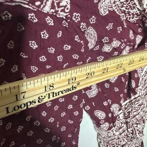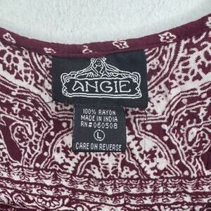 Angie Boho Peasant Blouse Top L Burgundy Paisley Print Tassel Tie Rayon Festival