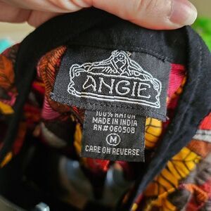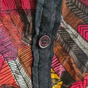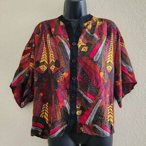 Bright and bold, this Angie button-front blouse features a lightweight fabric with a vibrant allover feather print in shades of red, orange, yellow, and black. Designed with a relaxed, oversized fit, it has wide short sleeves, a black button placket, and a soft drape that makes it perfect for layering. Effortlessly boho-chic, this top pairs well with jeans, shorts, or leggings for an easy statement look.