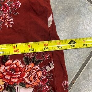 This Angie Cardigan in size L is a stylish and versatile piece perfect for a cowgirl or boho chic look. Featuring a beautiful floral pattern with a brick bull skull design, this cardigan has kimono sleeves and a relaxed fit for added comfort. Made from lightweight rayon material, it is machine washable and suitable for various occasions from casual to party. The brown color and vintage-inspired theme make it a unique addition to any wardrobe, ideal for layering in all seasons.