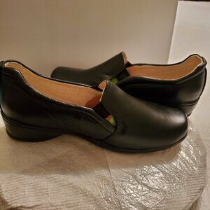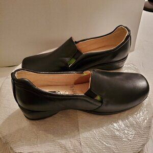 Women's Black Slip On 1.5" Hight Hell Sleep Resistant. Square toe 100% Leather, Comfort padded insole.