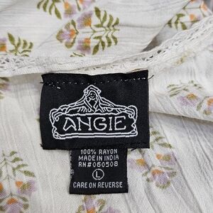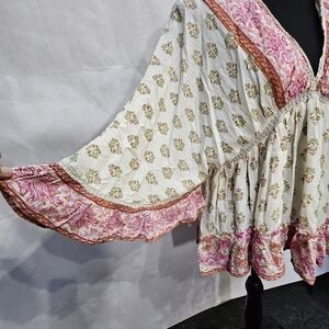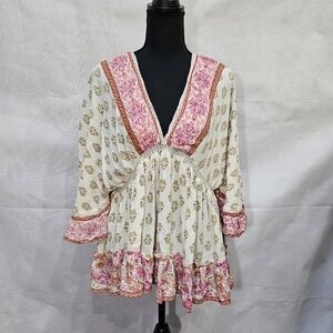 Angie Dolman Sleeve V-neck Empire Waist Ruffled Hem Floral Pullover Top Sz L