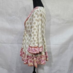 Red, pink, orange, cream, green and purple floral free flow Boho blouse with crochet empire waist line. Ruffle sleeves and hem line. 100% Rayon. Size L