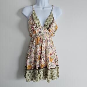 Angie Dress Womens Medium Cream Green Floral Boho Sundress Mini Ruffle Hem V Neck