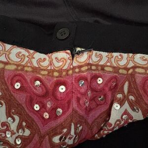 Eye-catching boho skirt from Angie. Features an ornate baroque paisley inspired pink, red, and gold print with sequin embellishments, flowy black base, and side zip with button closure. Fully lined for comfort.