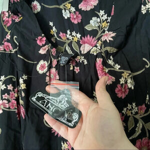 • features This brand new Angie mini dress in Size Large features a bohemian floral print on a black background. With its trendy cold shoulder design and chic mock neck, it offers a flowy and comfortable silhouette. Perfect for summer outings or festival wear, adding a feminine and stylish touch to your look. Made from 100% Rayon.