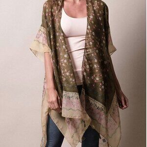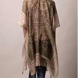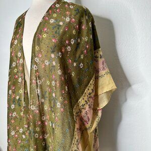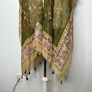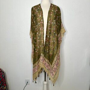 Angie Green Floral Lightweight Open Tassel Cape Cardigan Wrap One Size