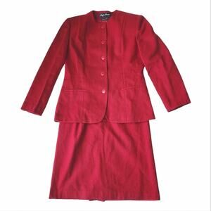 Style: vintage 80s blazer skirt set. business. professional. holiday. slit in back. zipper and button enclosure. lined. shoulder pads. pockets on blazer could be functional.