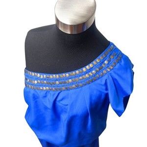 Angie EUC One Shoulder Royal Blue Mini Dress size M . Only worn a couple of times! Blue with brass studs and a little ruffle sleeve- measures approximately 33” from shoulder to hem. Elastic waist is about 15” flat. Dress has a small flaw see picture #7. Sold as is no returns on this item. It is a beautiful dress. Vibrant Royal Blue mini dress for a night out, vacay, cruise wear.