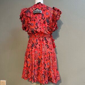 Embrace effortless style with this Angie sundress, featuring a vibrant red and orange palette. The wrap design and tie front create a flattering silhouette, while the short flutter sleeves and v-neckline add a touch of elegance. Perfect for casual outings or resort wear, this dress combines comfort and chic in one stunning piece.