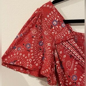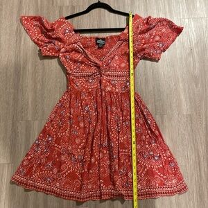 Chic mini dress by Angie. Features a vibrant red floral pattern. Perfect for casual outings.