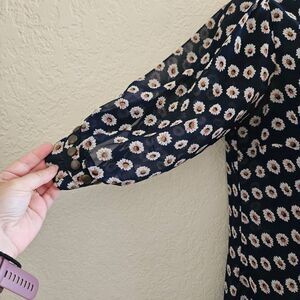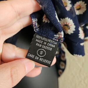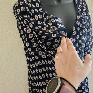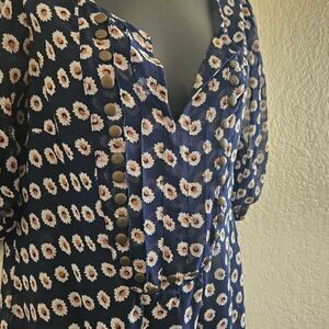 This is a sheer blue blouse by Angie. It features white floral print, pleating on the chest, and metal embellishments on the chest and sleeves.
