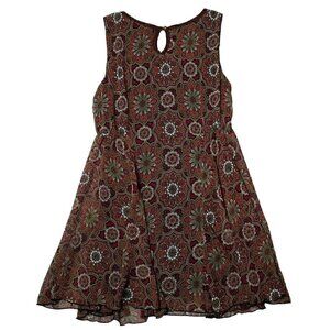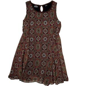 Great looking sleeveless crew neck dress with a beautiful fall color medallion print. This super cute dress is fully lined and has a soft brown trim around the neck and key hole back closure.