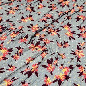 Angie floral periwinkle blue smocked dress with orange tropical flower print, ruffle at the hem, stretchy smocked bodice, and elastic sleeves.