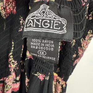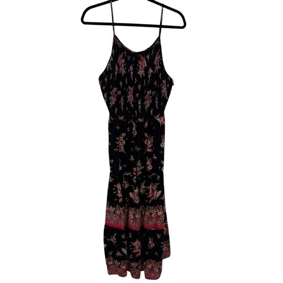 Angie Smocked strappy Maxy Dress size 1X Black Floral Rayon Boho Pattern