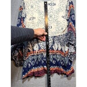 Angie Tunic Top Women's Medium Multicolor Floral V-Neck Bell Sleeve Pullover.