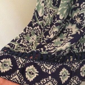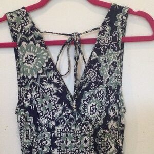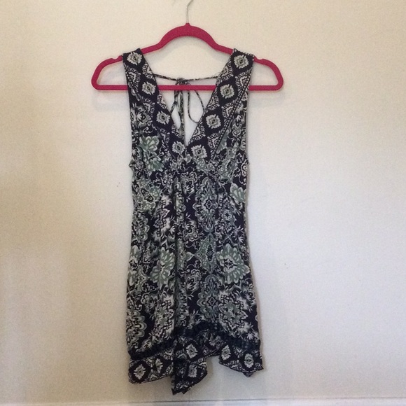 Angie V Neckline Patterned Romper With Pockets. Ties in the back at neckline and has a little lace detailing on the legs.