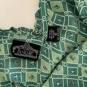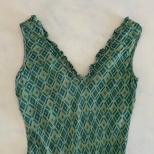 -Details: 90's, A-line with slight flare on bottom, geometric diamond pattern, sleeveless, green V-neck dress with a ruffled trim along the neckline, in excellent pre-loved condition