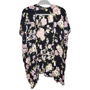 Angie Womens Black Floral Pattern Open Front Flowy Oversized Rayon Kimono Small