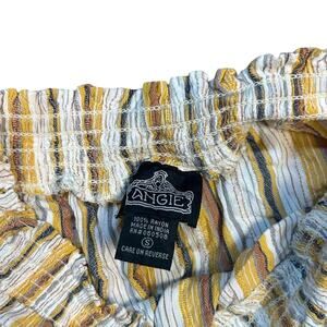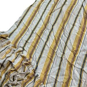 Lightweight flowy maxi skirt with pinstripe pattern. Features an asymmetrical hem with ruffled trim for a boho-inspired silhouette. Minor thread pull and small pinhole shown. Good condition.
