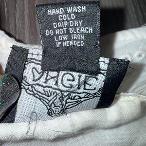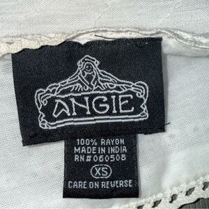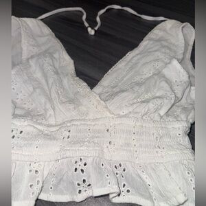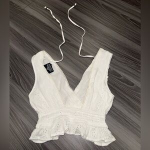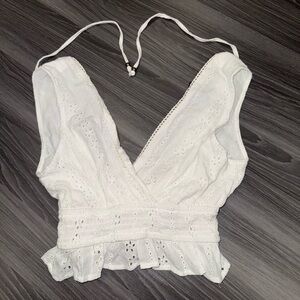 Chic white eyelet crop top with a ruffled hem. Features a deep V-neck and adjustable straps.