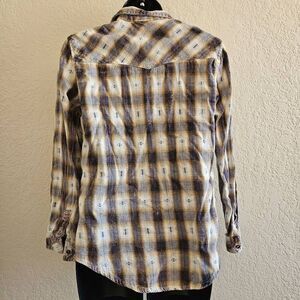 This is a long sleeved button-down shirt by Angie. It has a Southwestern plaid print. Note some loose threads on the side seam, as shown in the photos. There are two small buttoned pockets on the chest.