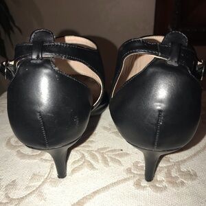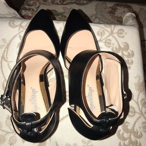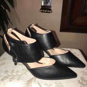 Women’s angel steps pointed toes shoes in black wide straps across the ankle with two buckle opening on side of heels size 10 gently used