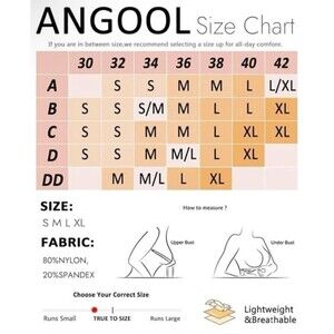 Brand new with tags Angool Beige Strapless Bra Women's M Padded Non-Slip Wirefree Bandeau Bralette. Material is 80% nylon 20% spandex. Model is D35. Comes with a package fo the clear straps if you wish to add them for extra support. Padding is removeable and not super thick. Stored in a smoke-free environment.