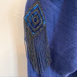 Rare Vintage 80s/90s Rib-Knit Lambswool & Angora Beaded Tassel Sweater In Blue. Women's Size Medium. Made in Hong Kong. Angora/lambswool blend, sequin diamond shape epaulets at shoulders with multi-color beaded tassel detail, crewneck, and shoulder pads for structure. Approximate measurements: 21" chest, 31" sleeves, 26" length (measured flat). Very good pre-owned condition, with moderate signs of wear throughout. Pin size hole at sleeve that cannot be seen while worn and small surface mark at back that should be fine when washed. Reminder: due to the nature of angora, it is not unusual to see long fluffy hair-like strands throughout the sweater, that is not a sign of peeling.