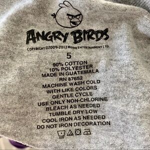 Cute little grey Angry Birds t-shirt. Has contrasting teal at the sleeve and hem edges. Writing in the graphic is sparkly. In excellent condition. No stains or holes. 12" pit to pit with stretch, 16.5" length.