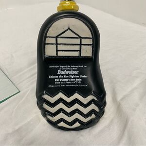 This Anheuser Busch 1997 The Fire Fighters Series Budweiser Fire Fighter's Boot Stein is a must-have for any collector of breweriana. The stein, made by Ceramarte in Brazil, stands at 8 1/2" (21.59cm) tall and is crafted from ceramic. It features the iconic Budweiser logo and is part of the Fire Fighters Series.