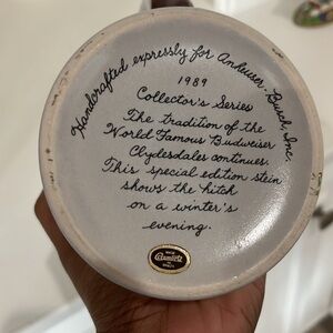 1989 Collector's Series Stein Handcrafted expressly for Anheuser-Busch, Inc. showing the tradition of the World Famous Budweiser Clydesdales continues.  This special edition stein shows the hitch on a winter's evening.  This stein is in mint condition, never used displayed in a non smoking home.  It is a beautiful stein and the design is raised so the horses seem to come right out of the winter scene.