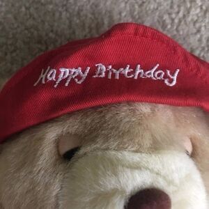 Teddy Bear with sleepy eyes, a red bow tie and a happy birthday hat