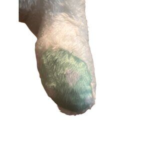 This charming plush dog stuffed animal features a delightful brown and white design with green paws with white hearts. Perfect for cuddling or as a decorative piece, it's an adorable addition to any collection.