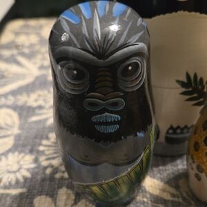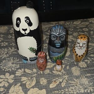 Set of animal-themed nesting dolls featuring a panda, gorilla, leopard, and more. Perfect for collectors.