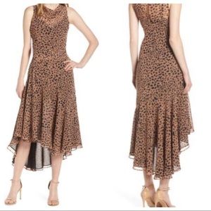 Animal print georgette dress. High cowl neck, asymmetrical hem and ruching. Hidden back-zip closure; back keyhole with button-and-loop closure, lined