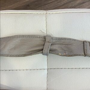 2 front outside pockets, in large back outside pocket. Inside has 2 open pockets and a zipper pocket. Strap and bottom has wear and peeling!