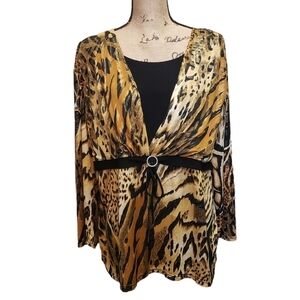 Stylish animal print in metallic fabric top with long sleeves. Features a partial wrap belt with rhinestone accent.