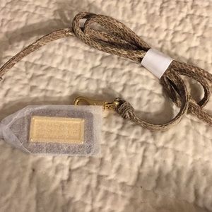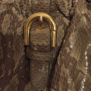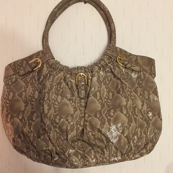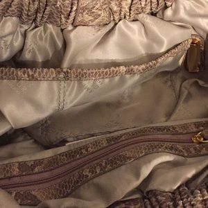 Beautiful soft embossed leather in shades of cream and tan. Circular handles fit comfortably on shoulders or can be hand held. Very spacious bag with signature lining. Interior has one zipper pocket and two slip pockets and a hook for keys. Comes with removable shoulder strap. Decorative hardware is gold tone. Dust bag included. Never used. NWOT