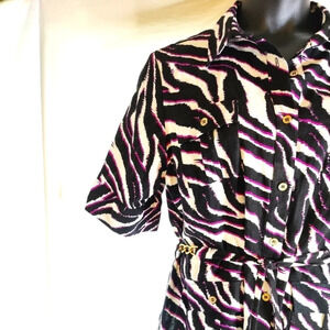 Awesome animal print (zebra) blouse with gold accents, pockets and a sash. Button down design. Brand new with tags. Black white and purple/pink ๐คทโโ๏ธ. Unique and fun.