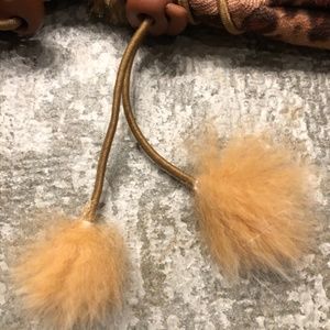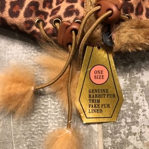 Faux suede animal print rabbit fur trimmed fingerless gloves with faux fur trim. Drawstring closure.