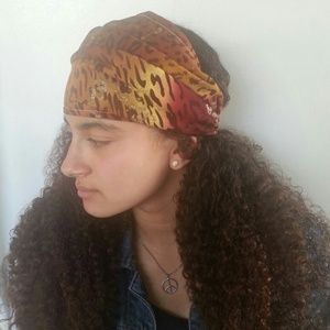 Leopard print in earthtones of b browm, mustard, brick, and a splash of metallic gold through out the headband. Design and Handmade by me.