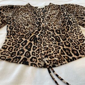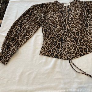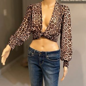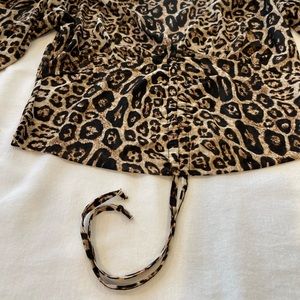 This super fun crop top in animal print has an e adjustable Rouching feature right in the center of the bottom. Pull the strings and make it a crop top! Leave them loose for a fuller blouse effect.