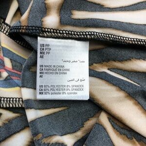Brown and Tan Tiger Stripe Print with pops of Bright Royal Blue and Red. A Sleeveless Strappy style with Lightly padded inner bra and a Gold Ring Accent in Back