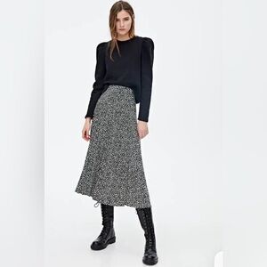 midi skirt with a black and white pattern. Versatile and chic for any wardrobe.