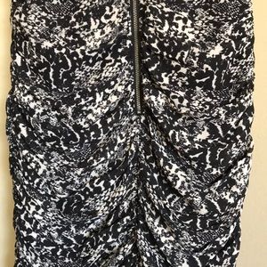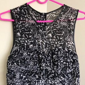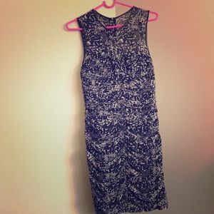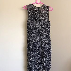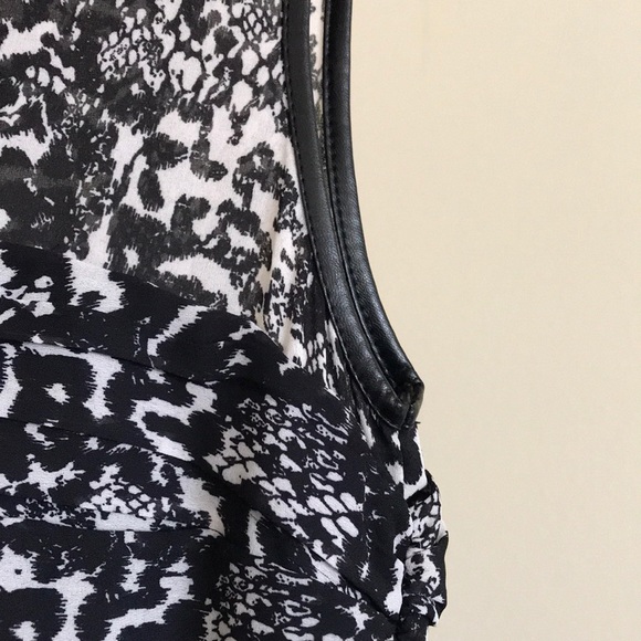 The dress is a size 4. It has a sheer feel to it. It is very sexy yet sophisticated. It’s a great little black dress with some stylish print to it. It zips up in the back and has a faux leather trim around the neck and arm lines. It has never been worn.