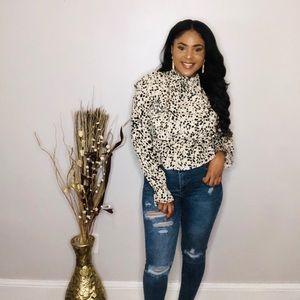 We’re obsessing over our animal print ruffled top if you’re looking to add something unique to your wardrobe this fall , well this top is perfect! Featuring a high neck , ruffled shoulders & sides, long loose fitting sleeves, keyhole back , and peplum bottom.