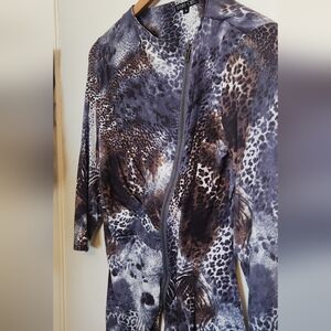 Stylish animal print tunic top for women. Features a blend of black, brown, and gray colors. Perfect for a chic and trendy look.